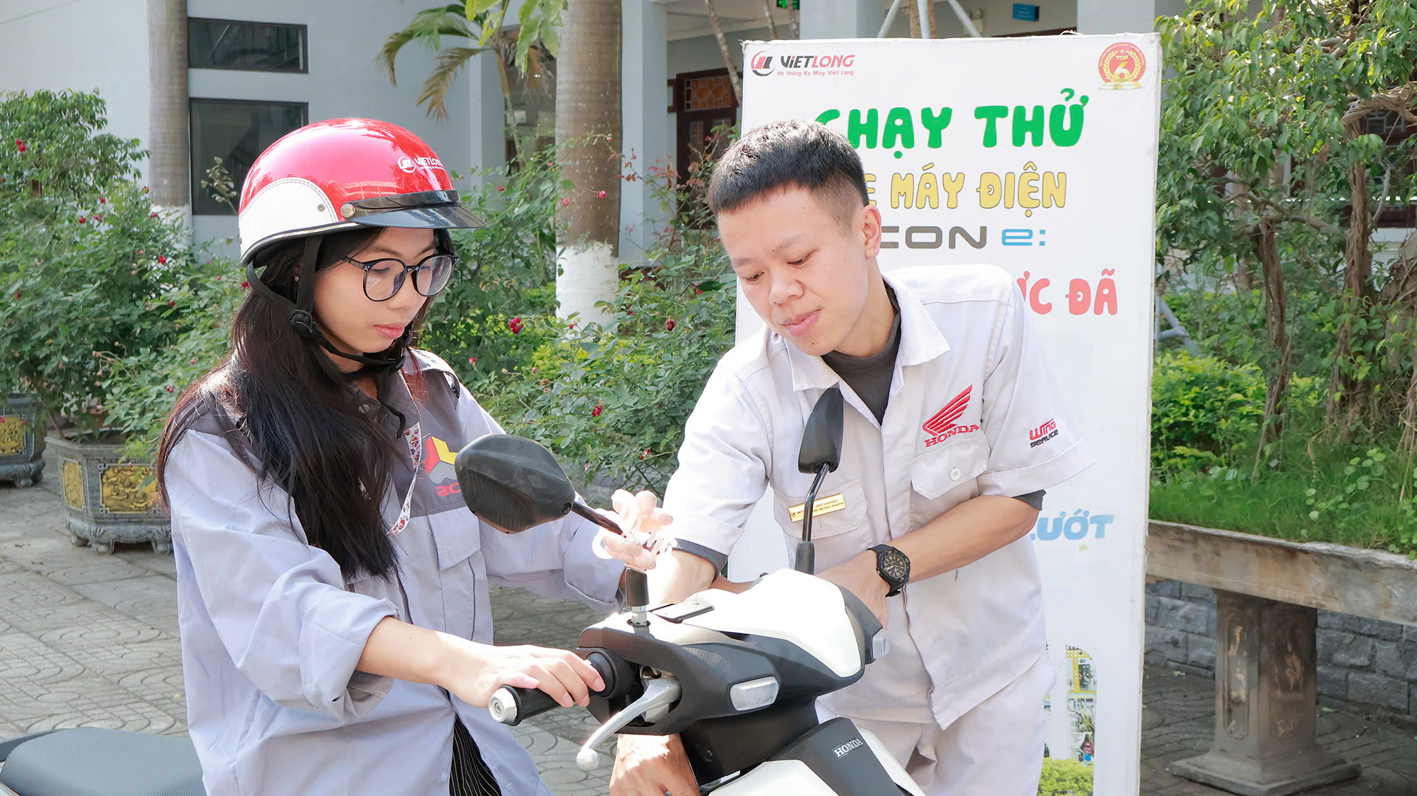 Kỹ thuật viên HEAD Việt Long tận tình hướng dẫn sinh viên cách đội mũ bảo hiểm và các thao tác điều khiển xe điện
