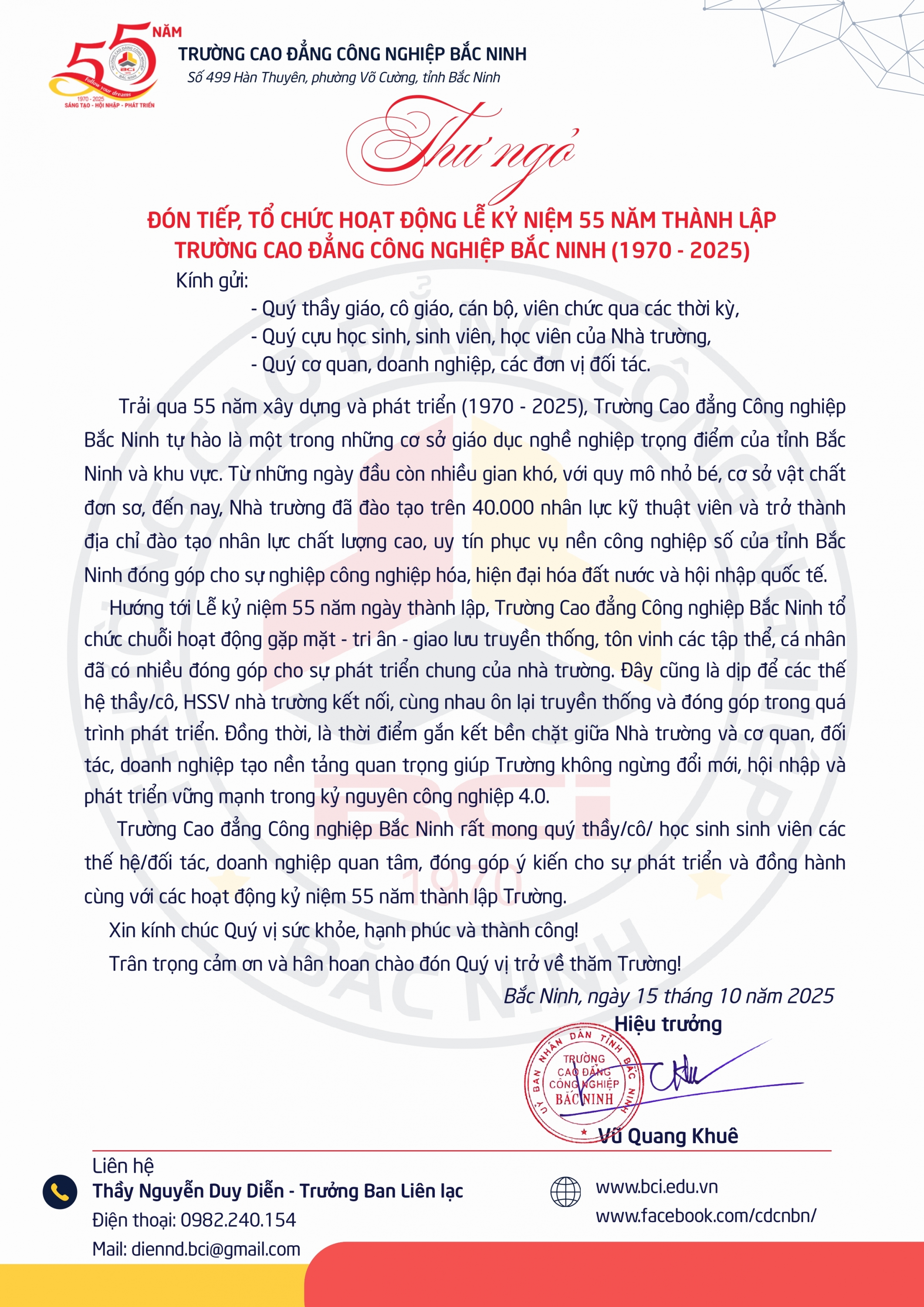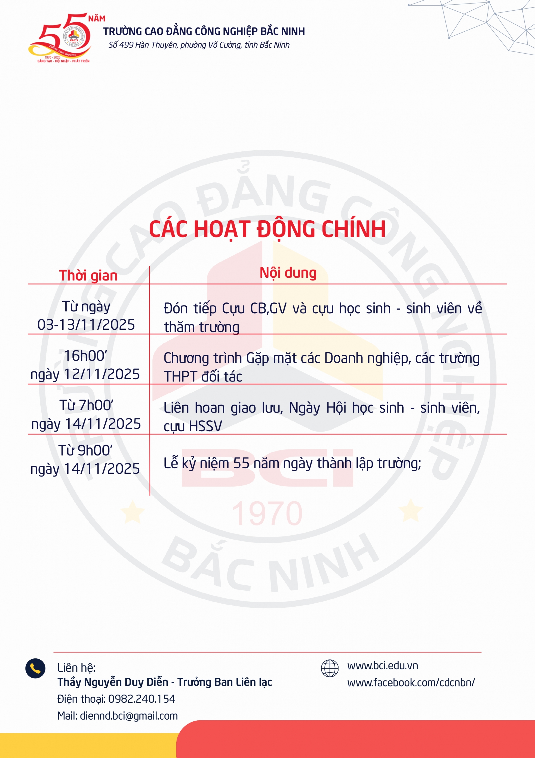 BCI trân trọng kính mời các cựu thầy, cô, cựu học sinh sinh viên các thế hệ, các lớp về thăm trường và dự các hoạt động cùng với CBGV, HSSV nhà trường nhân dịp 55 năm ngày truyền thống!
